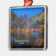 Ornament souvenir featuring a stunning early fall morning twilight view of the 64 ALT Bridge in Bennett Spring State Park, Bennett Springs, Missouri, USA. There are still stars out. You can see the waterfall from the dam on the other side of the bridge with a hint of some fog on this fall season morning.