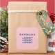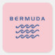 Stylized design shows three ocean or water waves and the word "Bermuda" above in a cool modern text. Design is all-blue. Bermuda pink background colour.