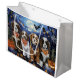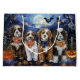 Unleash the spooky spirit with this eerie Halloween design featuring a pack of dogs under a dark, moonlit sky, surrounded by flying bats and glowing pumpkins. Perfect for those who love a touch of frightful fun with their furry friends!