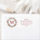Personnalisez votre adresse de retour de voeux de vacances avec votre monogramme et ce modèle de couronne de baies en or cuivre, rouge bordeaux et vert. Foliage, Berries thème boisé avec l'élégance d'une police de caractères tendance et message de voeux de vacances intemporel.