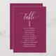 Aidez vos invités à trouver leur table avec cette élégante carte moderne de plan de salon avec les noms des invités. Cartes recto-verso pour que les clients puissent chercher leur nom à l'avant ou à l'arrière. Libérez de l'espace tout autour en vous donnant la liberté d'utiliser des clips ou un trou de perforation pour accrocher des écrans, ou d'utiliser le support/cadre de table. Berry arrière - plan et texte blanc. Détails de calligraphie manuscrite moderne. Plusieurs options de couleur. Ayez tous les numéros de table dans la même couleur ou mélangez les couleurs selon le thème de couleur de votre événement. Une partie de notre collection "Berry, Blue and Burgundy Floral".