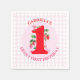 This berry first birthday design features a giant red number one surrounded by watercolor strawberries and blossoms in pink and red with green leaves on a pink circle against a pink plaid background. You can modify the name and the event. See the whole matching collection.