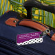Clever custom luggage tags with black and white polka dots and purple accent colour with words "not your bag". Designed for women or girls you can personalize and let your baggage stand out while you're travelling, at the gym or anywhere you want to put an ID tag you can customize.