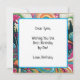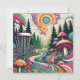 Wishing you the best birthday by par. A unique colourful disc golf course in a field of retro mushrooms, pine trees, colourful swirling cloud, sunsine in vintage colours like blue, green, pink and orange.
