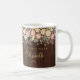 Chef personalized vintage rustic country chic kitchen coffee mug featuring delicate blush pink, peachy cream, and sage green floral botanical wildflowers borders on a dark brown barn wood background with string lights. +++++++++++++ It can be a beautiful keepsake personalized gift for a cooking gourmet lover, for an anniversary, birthday, Christmas, a bridal shower, or a wedding gift.