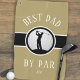 Best Dad By Par golf quote design in trendy white font features a male golfer silhouette set on a realistic golf ball image. The golf ball is placed on a black circle outlined in white complemented by a matching black band also outlined in white. The background is gold colour. Personalize with template to add custom monogrammed initials or short line of text. If you have any questions regarding this or any of my designs please contact beachpausedesigns@gmail.com. Makes a perfect Father's Day or Birthday surprise for Dad! Custom requests accepted.