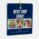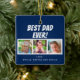 This Christmas tree ornament is an awesome Christmas, Father's Day or birthday gift for any dad. The design offers three photo frames for photos of children or dad on a navy blue background. "Best Dad Ever" appears in bold white text above the pictures. Personalize this heartfelt gift with the names of his children.