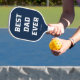 This modern navy blue and white pickleball paddle for Father's Day says "Best Dad Ever" in bold, masculine white typography on a dark blue background.