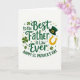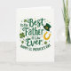 This greeting card features a digital illustration on a bright white background, with the main message “To the Best Father in Law Ever” centered in deep emerald green lettering that feels like a warm, familiar hug 💚. Just below, “Happy St. Patrick’s Day” curves along the lower area in the same green, set in a simple, friendly style that balances the larger headline. Small three-leaf shamrocks in rich green are scattered around the words like little nods of affection, adding gentle movement without crowding the space ☘️. In the upper right corner, a dark green leprechaun hat sits at a jaunty angle, and its golden buckle catches the eye like a small flash of celebration. Beneath the hat, a golden horseshoe rests as a lucky accent, echoing the warm tone of the buckle. Tiny gold sparkles dot the area around the text, like confetti frozen midair. The hat, horseshoe, and sparkles cluster toward the right side while the shamrocks lightly pepper the open white space around the centered green lettering.