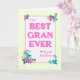 A pretty Mother's Day card for the BEST GRAN EVER. The design has a yellow check gingham border surrounding the words, 'To the BEST GRAN EVER Across the Miles', in magenta pink lettering on a lightly textured white background. There are bright clusters of multi-colored flowers in the corners and a small magenta pink heart. The inside message can be customized or deleted if you wish.
