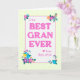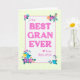 A pretty Mother's Day card for the BEST GRAN EVER. The design has a yellow check gingham border surrounding the words, 'To the BEST GRAN EVER From Both of Us', in magenta pink lettering on a lightly textured white background. There are bright clusters of multi-colored flowers in the corners and a small magenta pink heart. The inside message can be customized or deleted if you wish.