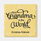 Elegant custom script typography design with words, "Best Grandma in the World" in black calligraphy letters with special glyph accents. Area below for your custom name or message. Background is refreshing yellow and white flower pattern.