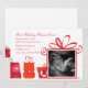 Feature your ultrasound in a Christmas present and send your "gift" to everyone on your mailing list to announce your baby's on the way. The white background has a border of brightly-wrapped gifts and the biggest present is a window for your baby's ultrasound. The card is easy to customize with your wording, font, font colour and choice of six paper types.