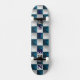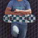 This skateboard features a geometric pattern chequerboard squares design with a triangular motif in a modern, minimalist style. The words BEST M AN are on the skateboard vertically. The pattern consists of alternating metallic blue and metallic silver triangular shapes arranged in a grid formation. The truck width is 5.25. The trucks are all terrain skateboard trucks.