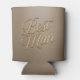 This can cooler has a solid matte light brown color. The script Best Man has a glossy, reflective quality with highlights and shadows that give it a three-dimensional appearance. The cooler is made of polyurethane foam. The cooler covers 12 ounce cans. The can cooler will help to keep your hands warm and your drinks cold. You can add a name or initials with the Personalize button. The metallic finish of the text creates a luxurious, formal aesthetic suitable for weddings or formal events.