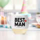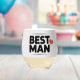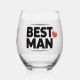This is a Best Man stemless wine glass. There is a red heart on the right of the words Best and Man. The wine glass has a 16 ounce capacity. This stemless wine glass is perfect for bachelorette parties, mother's day or book club. The wine glass comes in an event-based beverage container. There are year-round use-cases. The stemless wine glass dimensions are 4.25" height and 3.375" diameter.