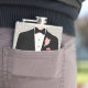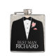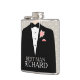 Smartly dressed best man in tuxedo and black bow tie graphic wedding hip flask. Reads Best man Richard. Personalize with your own name and title. A great personalized gift idea for male bonding on bucks nights / stag nights, wedding rehearsals or as a wedding favour.