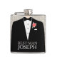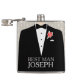 Smartly dressed best man in tuxedo and black bow tie graphic wedding hip flask. Reads Best man Joseph. Personalize with your own name and title. A great personalized gift idea for male bonding on bucks nights / stag nights, wedding rehearsals or as a wedding favour.