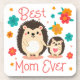 Adorable coaster for a mother's day treat featuring a cute illustration of a mommy hedgehog holding the hand of her baby hedgehog. The little hedgehog is holding a pink love heart. Both hedgehogs have dark brown spines and a tan body, each have rosy cheeks, shiny eyes and a little smile. Floating around above the cute animals are colourful flowers in blue, yellow and red. Fun pink font above and below the illustration reads 'Best Mom Ever'.