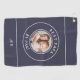 Creating your own golf towel is easy with our user-friendly template. All you need to do is upload your best photo and enter your initials, name, or any text you want. You can also customize the colours of the text and the background to match your papa's style. The photo and the text are printed in white with two circular white borders, creating a striking contrast with the classic navy blue background.