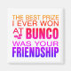 Modern typography style text for your Bunco best friend. Bunco dice sentiment reads: The best prize I ever won at Bunco was your friendship. Colorful and made just for Bunco players. Great as friendship gift.