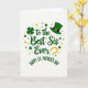 This card features a white background filled with green and gold St. Patrick’s Day details that feel like a sweet nod from one sister to another 💚. Centered on the front, the large message “to the Best Sis Ever” appears in emerald green, with smooth, flowing letters that draw the eye right away. Just beneath it, “HAPPY ST. PATRICK’S DAY” curves in a sturdier green type, forming a gentle arc that frames the main line. Around the words, small four-leaf clovers, gold stars, and scattered dots float like confetti, giving the layout a lively, affectionate energy ☘️. The greens range from deep forest to bright emerald, while the gold accents add little flashes of shine without crowding the page. In the upper right corner, a tilted deep green leprechaun hat with a gold buckle adds a cheeky, friendly touch, as if it’s tipping hello. Near the bottom, a golden horseshoe sits in a graceful curve, nestled among clovers and tiny starbursts.
