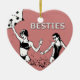 Two attractive female best friends are having fun at the beach, splashing in the water and carrying an umbrella. One has a bikini and the other woman is wearing a one piece bathing suit. Text reads Besties in white with black outlines just above them. Simple line drawing in black and white. Excellent gift idea for best friends, and great for special occasions such as birthdays, vacations, and more.