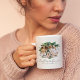 Elegant best friends keepsake coffee mug featuring the cute saying 'besties forever' that incorporates a heart centre, 2 photo either side of your bffs, and your names.
