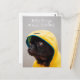 Features a photograph of a cute black pug dog in a Silver Paw yellow rain coat.