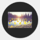 Beutiful lake in the sun rise with plastic dack classic round sticker