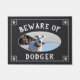 Funny welcome doormat in black and white with pawprints, a photo of your beloved dog, urging your visitors to beware of your dog! Add your dog's name and photo.