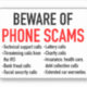 "Beware of phone scams" Detailed text to spread the word: to be cautious about phone calls as there may be scammers trying to steal information or money from you. The most common ones being Technical Support scams, IRS scams, bank fraud and debt scams.