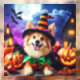 A fluffy, smiling dog dressed in an adorable witch costume steals the show in this Halloween scene. Sporting a pointy hat and a pumpkin-themed outfit, the pup sits proudly amidst carved pumpkins, flickering candles, and spooky houses silhouetted against a full moon.