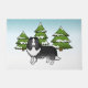 Destei's original cartoon illustration of a cute bi-black / black and white coat colour Shetland Sheepdog / Sheltie breed dog. The dog is placed in a cold winter scene. In the scene it is snowing in the background and there are three green fir trees behind the dog. The trees have some snow on them. The background is a light blue to white gradient giving this design that freezing cold winter day look.