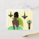 Our beautiful Bianca with black hair, dressed in mint green and white. Bianca is adorned with jewels and holds a kiwi green feathered fan. Black chandeliers and candelabra on a pale yellow background.