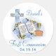 A lovely sticker featuring a bible nestled on a bed of blue roses with a blue cross in the back and a gold chalice. Perfect to adorn favours, favour bags or use as envelope seals.