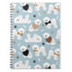 Cute bichon frise dogs in sweaters and bows with scattered dog bones and paw prints on a light blue background.