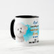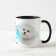 A portrait of an adorable white Bichon Frise dog is the feature on two sides of this mug. Each image is placed on a bright blue splatter background. Between the two images is the text that describes this loyal and loving companion, with "the BICHON FRISE" in black at the bottom. All the text is easily customized to anything you'd prefer so that you may describe your own loyal friend.