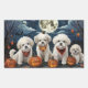Unleash the spooky spirit with this eerie Halloween design featuring a pack of dogs under a dark, moonlit sky, surrounded by flying bats and glowing pumpkins. Perfect for those who love a touch of frightful fun with their furry friends!