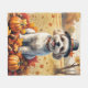 A watercolor-style painting of a cheerful dog sitting amidst a pile of vibrant fall leaves, surrounded by tiny pumpkins and scattered acorns. The dog wears a little pilgrim hat and beams with joy, capturing the spirit of Thanksgiving. In the background, soft harvest fields and golden-hued trees create a peaceful countryside ambiance. Gentle textures and warm, muted autumn tones give the scene a cozy, nostalgic feel perfect for celebrating the beauty of the season.