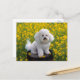 Aww...who can resist the cute face of a Bichon Frise puppy dog? This charming postcard features a portrait of a cute Bichon Frise sitting on a wooden barrel surrounded by yellow wildflowers. This sweet Bichon pup is ready to help you send greetings to family and friends.