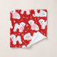 Cute Valentine's Day Bichon Frise dogs wearing red, pink, and white polka dot and heart sweaters with scattered paw prints and arrow on a red background.