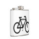 This hip flask features a simple, contemporary design of an abstract pattern of a black bicycle on a white background.