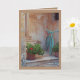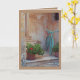 This scene of a turquoise bicycle and a potted red geranium on a front stoop. Blank inside with area for your own message.