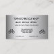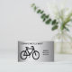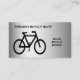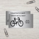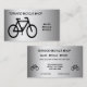 This business card advertises a bicycle shop specializing in sales, rentals and repairs. All text on front and back can be customized for your special business. It features a contemporary design of an abstract pattern of a black bicycle on a silver, grey and white metallic background.