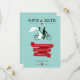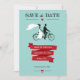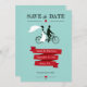 Trendy Enregistrer les cartes Date avec une mariée et marié sur un vélo tandem. Design vintage amusant avec une bannière rouge sur un arrière - plan aqua. Aussi disponible en d'autres couleurs. Obtenir la correspondance enregistrer les timbres de date ci-dessous :