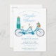 Cette invitation à la douche nuptiale ou à couple mignon et fantaisiste comprend un vélo tandem d'aquarelle chargé de cadeaux et une bouteille de champagne - prêt à célébrer le couple! Le devant comprend une jolie rime qui vole sur la moto. Il dit "Une fête pour deux, avant qu'ils disent "Je fais" En dessous de la moto est un texte personnalisable pour tous les détails de la douche nuptiale, y compris la date et l'heure, l'emplacement, le registre et RSVP. Le dos est installé sous forme de carte postale, ce qui en fait une option économique.
