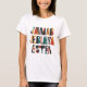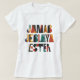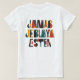 Un design de t-shirt dynamique avec le texte "Jambalaya Jester" dans une police ludique et multicolore. Les lettres pouvaient couler avec une texture crayon fondue, ou être ornées de minuscules notes musicales et de poivrons.