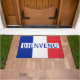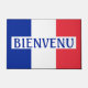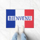 This custom welcome door mat features the greeting "Bienvenu" printed across the centre. Bienvenu is the French translation for "Welcome" and it is printed in blue across the centre in blue over a white banner. The France flag colours are bold and vibrant. Proudly greet your visitors to your French home or business. You can personalize the welcome mat to include your family or company name, or other custom text.