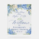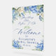 Élégant et féminin design de baby shower "quelque chose de bleu avant de le faire" avec des arrangements floraux peints à l'aquarelle de fleurs d'hydrangea bleues, de verdure et de roses blanches.